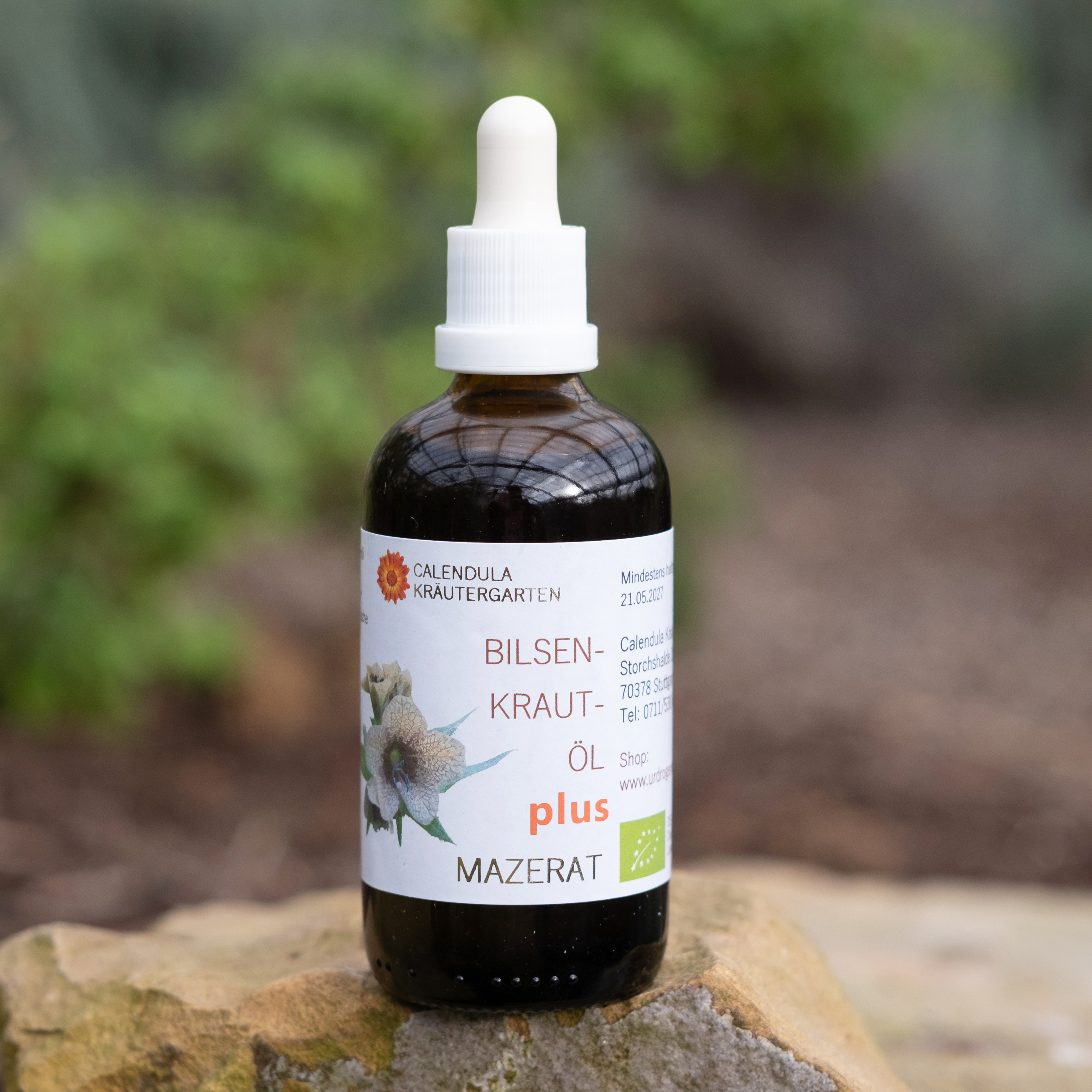 Im Sommer wird im Calendula-Kräutergarten das Bilsenkraut geerntet und anschließend in Bio-Olivenöl eingelegt. Das Öl wird mit dem Kraut schonend erwärmt und wieder abgekühlt. So werden die Pflanzenwirkstoffe von dem Öl am besten aufgenommen. Es entsteht ein wunderbares Naturprodukt, das als wohltuendes Mittel zur Linderung, auch von starken Schmerzen, unterstützend verwendet werden kann.