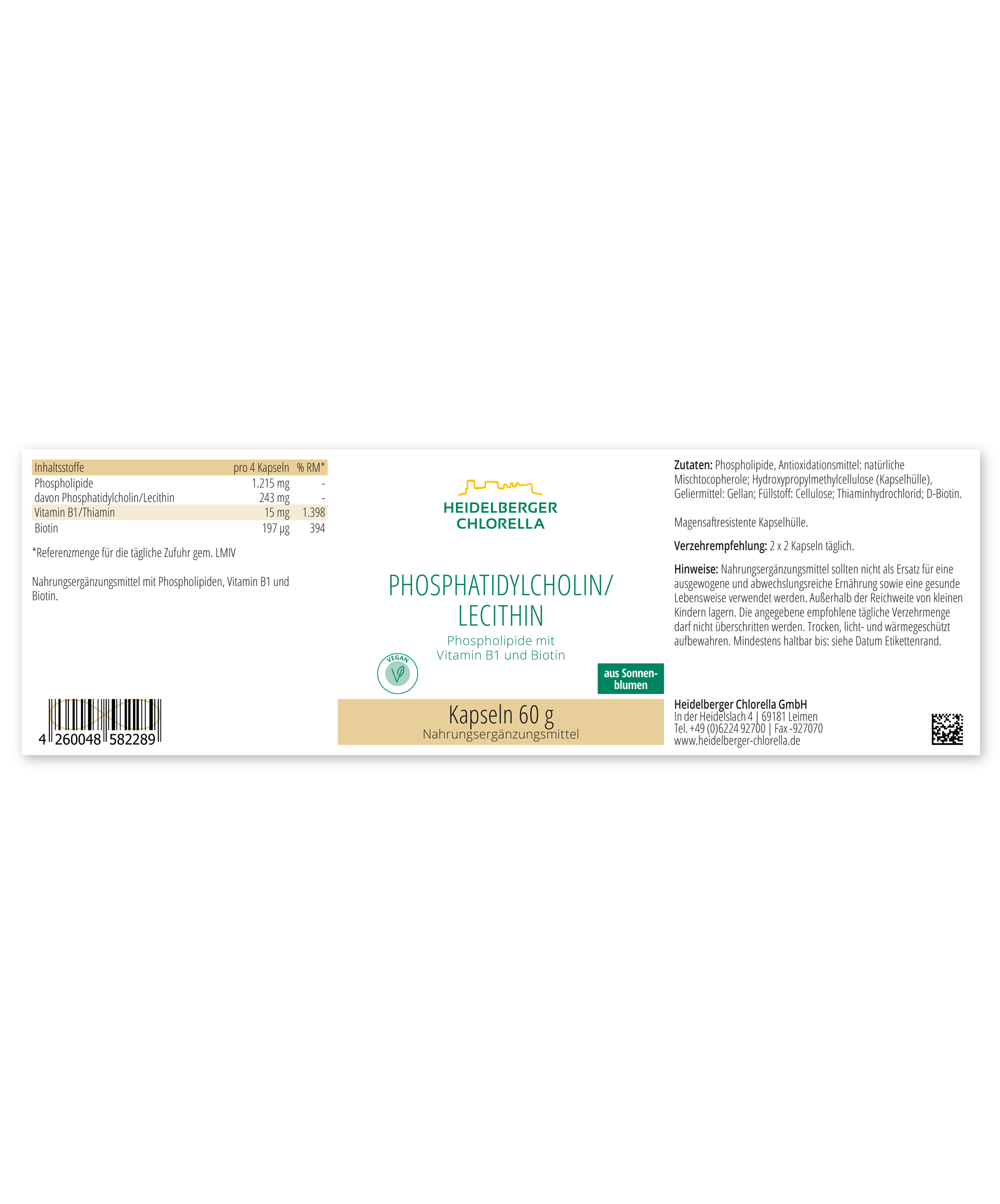 Phospholipide (davon 20 % Lecithin, Antioxidationsmittel: gemischte natürliche Tocopherole); magensaftresistente Kapselhülle: Hydroxypropylmethylcellulose (vegan), Geliermittel: Gellan; Füllstoff: Cellulose; Thiamin; Biotin.